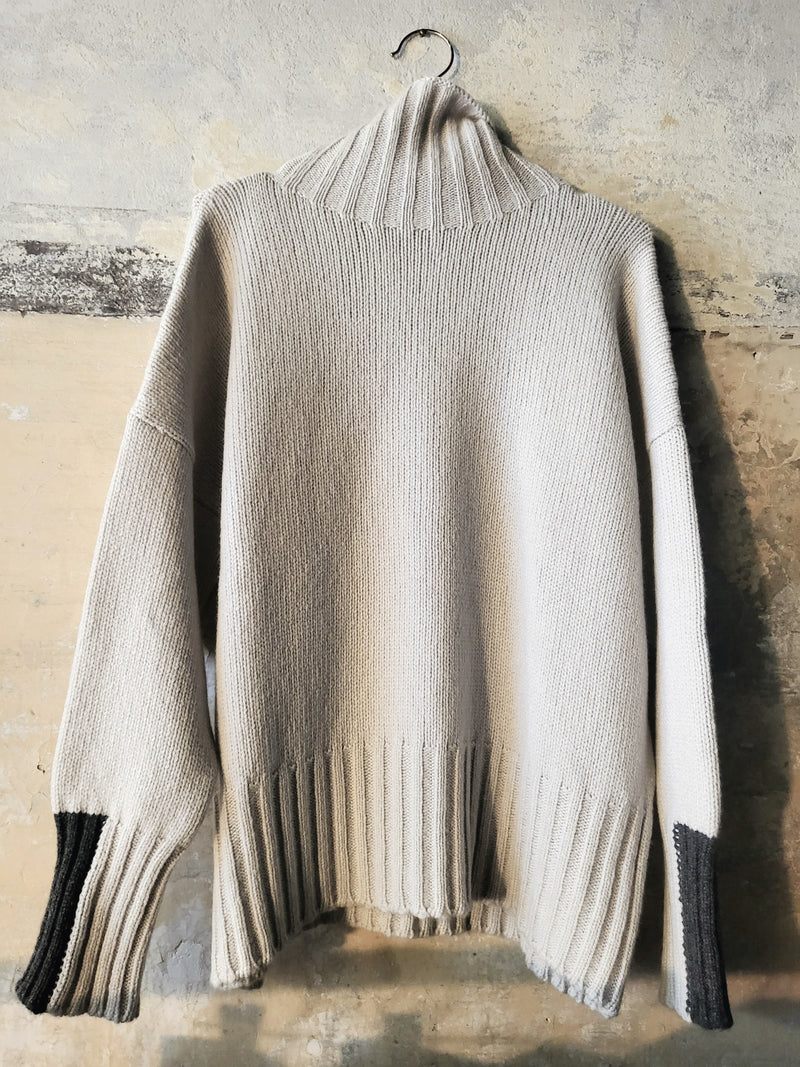 Turtleneck ribbed sweater, oversize fit. Unique bicolor ribbed wrist. Ribbed edge on the bottom too. Stockinette stitch, a precious yard that confers a unique sensation of softness and warmth at the same time