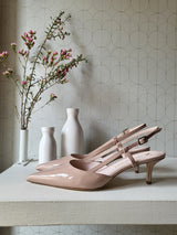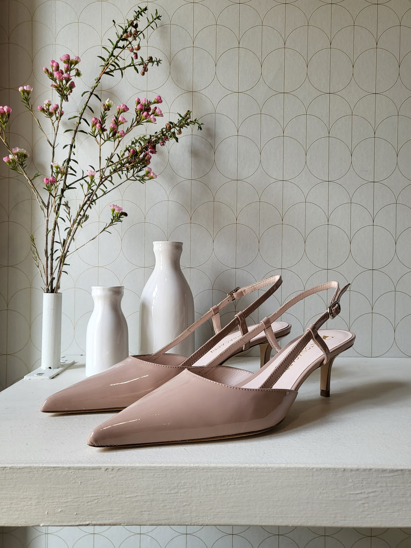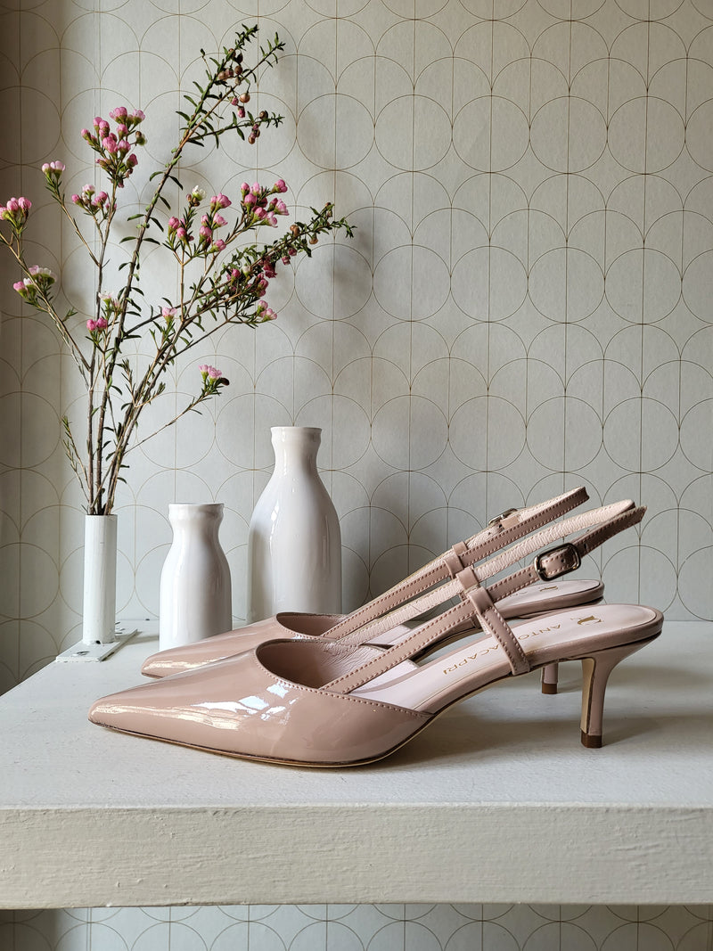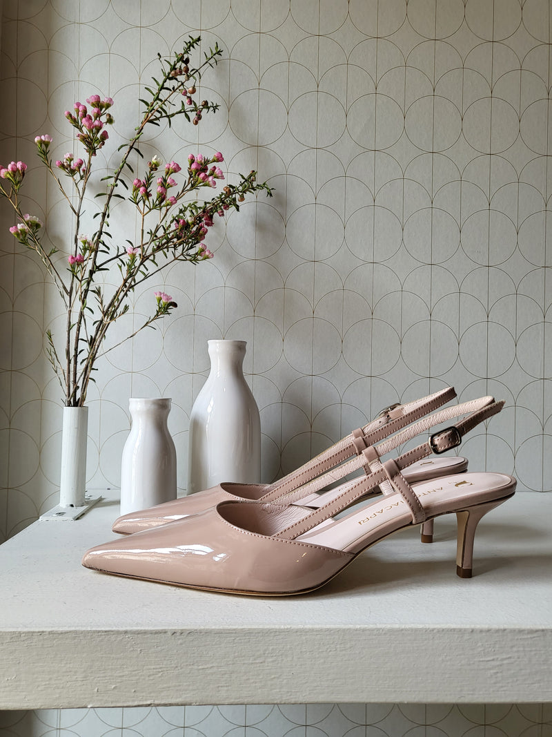 Elegante e sofisticato, il nostro slingback in vernice colore nude è il dettaglio perfetto per completare il tuo look. Con un tacco di 5 cm, offre un tocco di classe a tutti i tuoi outfit. Calzata regolare